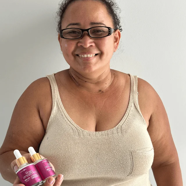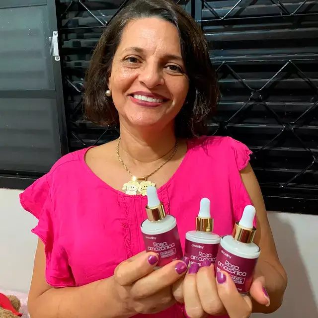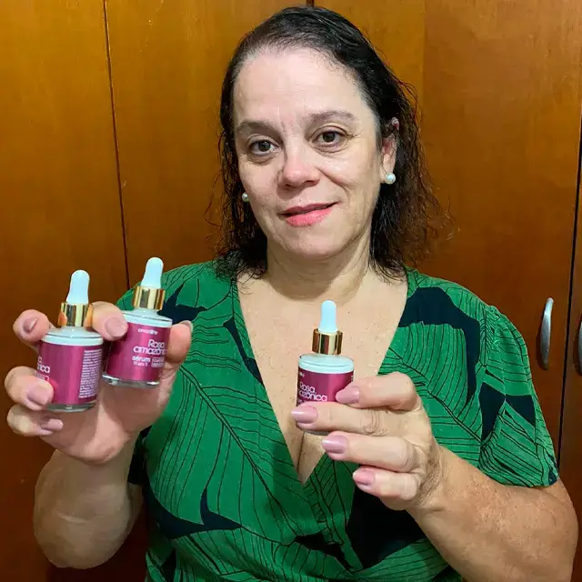 - “De início fiquei desconfiada…pois já fui enganada comprando produtos que não funcionaram em mim. Sorte a minha que eu estava errada! Escolhi o Kit com 3 frascos para testar. Graças a deus hoje posso sair na rua sem entopir o rosto de maquiagem para esconder as olheiras que eu tinha. Agradeço de coração à Rosa Amazônica e sua equipe por transformarem a minha vida!”.
